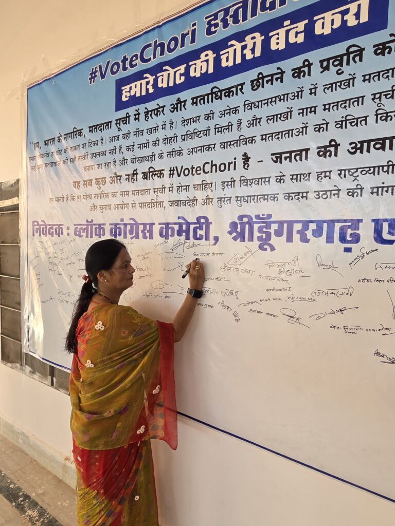 हम सब कार्यकर्ताओं को जागरूक होकर वोट चोरी रोकनी होगी। विधानसभा प्रभारी रामदेव ढाका ने भी अपने संबोधन में कहा कि प्रदेश कांग्रेस संगठन को सृजन करने में लगी है साथ ही जो जो कार्यकर्ता निष्क्रिय है उनकी सर्जरी भी की जा रही है। वोट चोरी पर बोलते हुए कहा कि हमें अपने अपने बूथ की वोटर लिस्ट को समय समय पर चेक करना होगा और नए वोटर्स का नाम जुड़वाना होगा इसके लिए सक्रिय होकर काम करना पड़ेगा। संविधान को तोड़ने का जो कार्य इस सरकार के इशारे पर चुनाव आयोग करने की कोशिश कर रहा है उसको रोकने में लिए हमें सारे मतभेद भुलाकर संघर्ष करना होगा तब जाकर हमे सफलता मिलेगी।