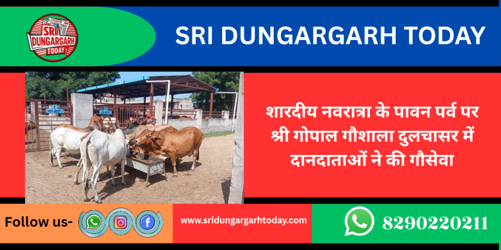 शारदीय नवरात्रों के दौरान श्री गोपाल गौशाला दुलचासर की गौवंश को गोपी किशन दामोदर मोहता परिवार निवासी दुलचासर प्रवासी सुरत के द्वारा आज की जल सेवा प्रदान की गई। सचिव रेवन्त सिंह पड़िहार ने बताया वहीं बीकानेर निवासी केशरी देव कुलरिया परिवार द्वारा गौशाला की गौ माताओं को एक बोरी बिनौला खल, एक बोरी मूंग चूरी, एक कटा रसकट गुड़ का पावन भंडारा करवा कर भोग लगवाया गया। सभी गौ भक्त दानदाताओं का गौशाला कमेटी ने आभार प्रकट कर मंगल कामना की ।