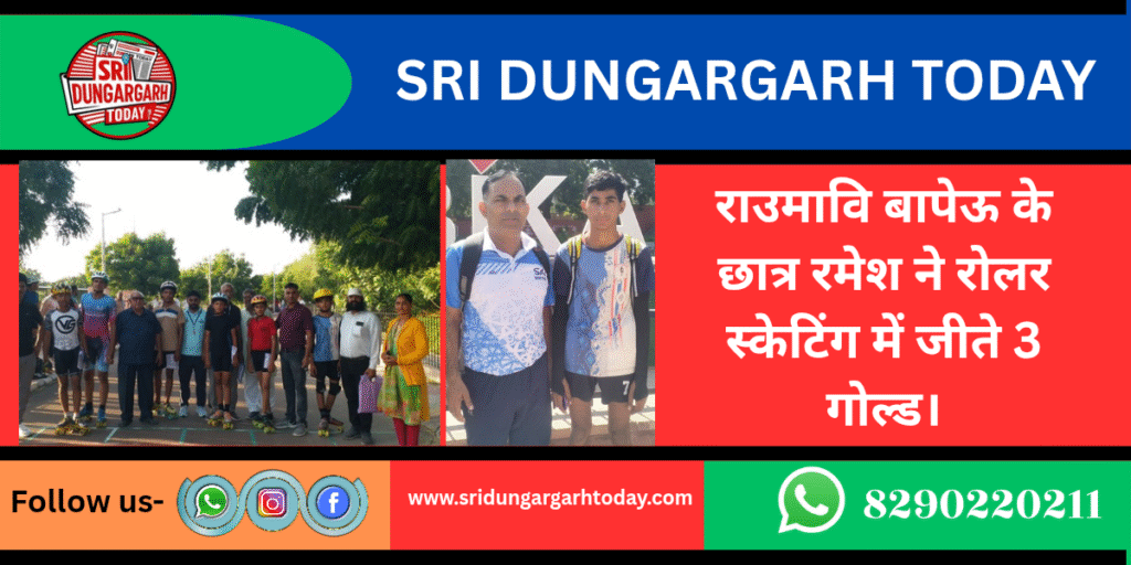 बीकानेर के महिला मंडल विद्यालय में आयोजित 69 वी जिला स्तरीय खेलकूद प्रतियोगिता 2025 में राजकीय उच्च माध्यमिक विद्यालय बापेऊ के छात्र रमेश स्वामी ने रोलर स्केटिंग की तीन प्रतियोगिताओं में गोल्ड जीत लिया है।शारीरिक शिक्षक नरेंद्र कुमार ने बताया की 17 वर्षीय छात्र वर्ग में 1000 मीटर रिंक रेस में ,3000 मीटर रोड़ रेस व इनलाइन रोड वन लेप इन तीनो ही प्रतियोगिता मे रमेश स्वामी ने स्वर्ण पदक हासिल किया है। शारीरिक शिक्षक नरेंद्र कुमार के मार्गदर्शन में पिछले दो साल से लगातार विद्यालय के छात्र जिला स्तर , राज्य स्तर और राष्ट्रीय स्तर पर पदक प्राप्त कर रहे है।