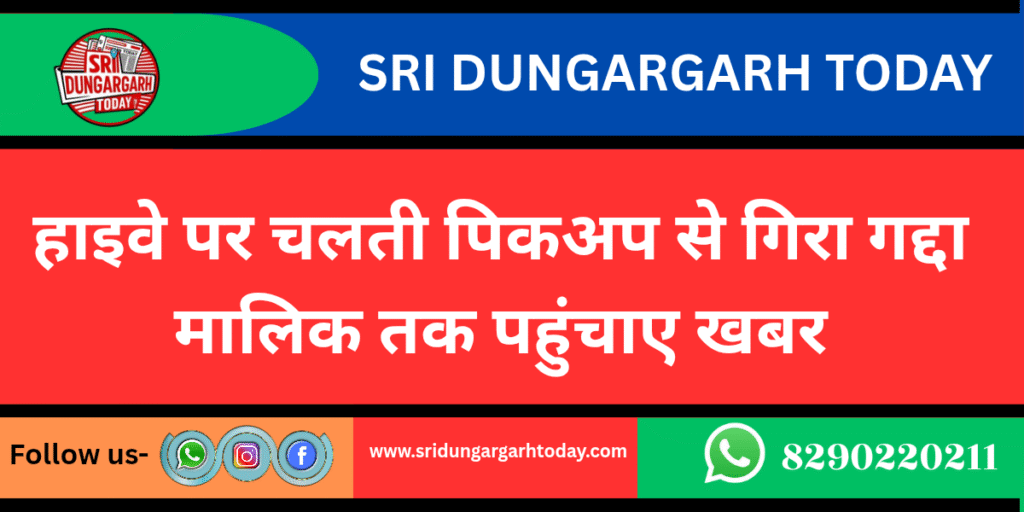श्री डूंगरगढ़/ नेशनल हाइवे पर कुछ देर पहले चलती पिकअप से एक गद्दा गिर गया जो सातलेरा गांव निवासी एक युवक को मिला है।मिली जानकारी के मुताबिक श्री डूंगरगढ़ से रतनगढ़ की तरफ जा रही पिकअप से सातलेरा बस स्टैंड पर एक गद्दा गिर गया।उसी समय बस से उतरी सवारी सत्यनारायण की नजर गद्दे पर पड़ी लेकिन तब तक पिकअप आगे निकल चुकी थी सत्यनारायण ने गद्दा उठाकर सामाजिक कार्यकर्ता गौरी शंकर तावनियाँ को संभला दिया । तावनियां ने बताया कि अगर किसी का गद्दा गिरा है तो वो मोबाइल नंबर 9928023965 पर संपर्क कर सकते है।तावनियां ने बताया कि गद्दा उनके पास सुरक्षित रखा हुआ ।