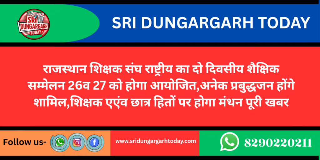 राजस्थान शिक्षक संघ राष्ट्रीय का दो दिवसीय शैक्षिक सम्मेलन 26व 27 सितंबर 2025 को राजकीय रूपा देवी मोहता उच्च माध्यमिक विद्यालय श्री डूंगरगढ़ में आयोजित होने जा रहा है, इसकी जानकारी देते हुए सम्मेलन के संयोजक एवं उप शाखा अध्यक्ष पवन शर्मा ने बताया कि 26 सितंबर को प्रथम दिवस के प्रथम सत्र में विभाग प्रचारक विनायकजी का पंच परिवर्तन पर उद्बोधन होगा इसके बाद 12:00 बजे उद्घाटन सत्र होगा उद्घाटन विधायक ताराचंद सारस्वत, रामगोपाल सुथार अध्यक्ष विश्वकर्मा कौशल विकास बोर्ड राज्य मंत्री करेंगे, बिहारी लाल बिश्नोई पूर्व विधायक नोखा, भाजपा के पूर्व शहर जिला अध्यक्ष एवं शिक्षाविद् सत्य प्रकाश आचार्य ,रमेश कुमार हर्ष उपनिदेशक माध्यमिक शिक्षा निदेशालय बीकानेर ,किशन दान चारण जिला शिक्षा अधिकारी मुख्यालय प्राथमिक / माध्यमिक बीकानेर ,सरोज वीर पूनिया मुख्य ब्लॉक शिक्षा अधिकारी श्री डूंगरगढ़,प्रदेश वरिष्ठ उपाध्यक्ष रवि आचार्य,प्रदेश उपाध्यक्ष ओम प्रकाश बिश्नोई भी कार्यक्रम में शिरकत करेंगें, इस दो दिवसीय शैक्षिक सम्मेलन में शिक्षक शिक्षार्थी एवं छात्र हितों पर चिंतन एवं मनन होगा तथा राष्ट्रीय शिक्षा नीति 2020, वर्तमान परिप्रेक्ष्य में शिक्षक की भूमिका पर विचार विमर्श होगा तथा शिक्षक सम्मेलन के दूसरे दिन खुला सत्र एवं शिक्षक समस्याओं पर विचार होगा तथा दूसरे दिवस में लिए गए प्रस्ताव उच्च अधिकारियों एवं राज्य सरकार को भेजें जायेंगे ,सम्मेलन में शिक्षकों की अधिकाधिक संख्या में उपस्थिति सुनिश्चित करने लिए जिले की सभी उप शाखों के अध्यक्ष एवं मंत्री लगातार शिक्षकों से संपर्क कर रहे हैंl