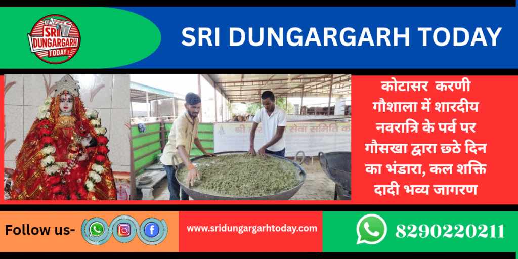 शारदीय नवरात्रि के अति पावन अवसर पर नौ दिवसीय भंडारा का आज छठे दिन का भंडारा गौसखा परम गौ भक्त दिलीप सिंह राठौड़ हनुमानगढ़ की तरफ से ₹2500 की राशि समर्पित कर गौ माताओं को मुंगचुरी का अति पावन भंडारा समर्पित कर सुख समृद्धि की कामना की है गौशाला कमेटी ने परिवार के लिए सुख समृद्धि की कामना करते हुए आभार व्यक्त किया।