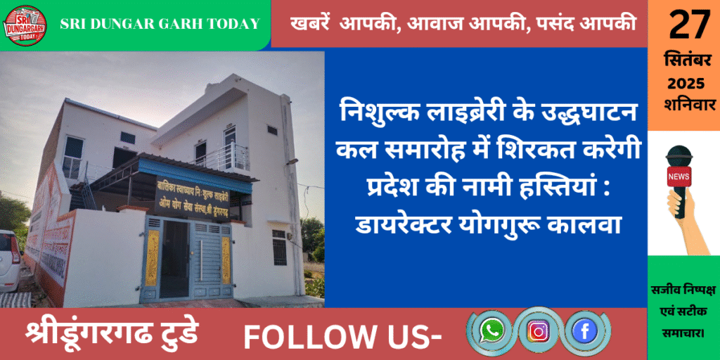 श्रीडूंगरगढ़ कस्बे की देवनारायण कॉलोनी में क्षेत्र की सर्व समाज की जरूरतमंद बेटियों के लिए संभाग की पहली निशुल्क लाइब्रेरी का उद्धघाटन एवं भामाशाह सम्मान समारोह होगा 28 सितंबर 2025 वार रविवार सुबह 11 बजे लाइब्रेरी के डायरेक्टर ख्याति प्राप्त योगाचार्य ओम प्रकाश कालवा ने बताया बालिका स्वाध्याय निशुल्क लाइब्रेरी जो क्षेत्र की 50 जरूरतमंद बेटियों के लिए शुरू की जा रही है। व्यवस्थापक हरीश कुमार शर्मा ने बताया इस लाइब्रेरी के मुख्य उद्देश्य