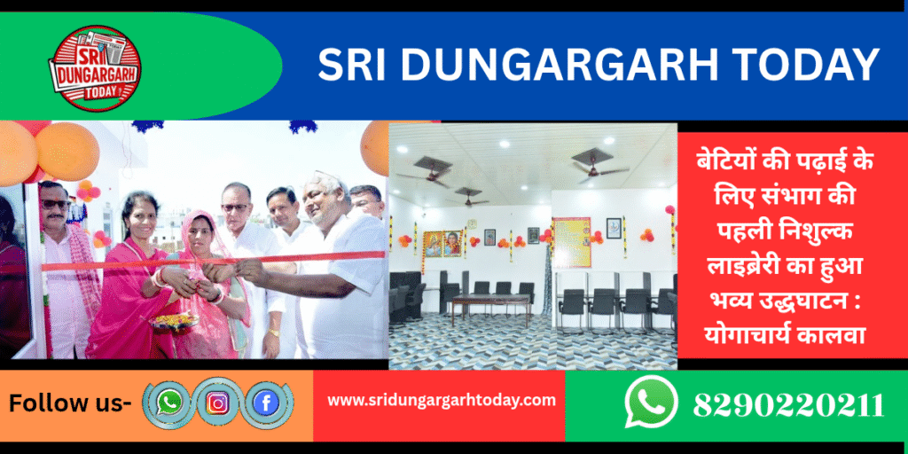 श्रीडूंगरगढ़ कस्बे की देवनारायण कॉलोनी में क्षेत्र की सर्व समाज की जरूरतमंद बेटियों के लिए संभाग की पहली निशुल्क लाइब्रेरी का हुआ भव्य उद्धघाटन बालिका स्वाध्याय निशुल्क लाइब्रेरी जो क्षेत्र की 50 जरूरतमंद बेटियों के लिए शुरू हुई है। जिसका उद्घाटन कस्बे के समाज सेवी व भामाशाह श्रीगोपाल राठी के कर कमलों द्वारा किया गया कार्यक्रम के मुख्य अतिथि परम आदरणीय गुरूदेव रामदेव जी बोहरा रहे मुख्य वक्ता के रूप में राजस्थान योग प्रशिक्षक महासंघ के प्रदेश अध्यक्ष क्रांतिकारी योगाचार्य रामावतार यादव सीकर विशिष्ट अतिथि किशनगढ़ इंडसइंड ब्रांच एवीपी सह शाखा प्रबंधक नरेंद्र सिंह राजपुरोहित, पटवारी हरिराम सारण, माध्यमिक शिक्षा निदेशालय निजी सचिव दीपक शर्मा, अखिल भारतीय राजपुरोहित नारी शक्ति समिति राष्ट्रीय अध्यक्षा सोनिया राजपुरोहित, सेसोमू स्कूल के चेयरमैन पदमा जगदीश मूंधड़ा कार्यक्रम की अध्यक्षता सेवानिवृत जिला शिक्षा अधिकारी गजानंद सेवग चेयरमैन मंजु देवी व्यवस्थापक हरीश कुमार शर्मा कार्यकारिणी सदस्य राकेश कुमार पडिहार, दामोदर बोहरा, मनीष कुमार धामा, सहीराम रोलन, नवीन शर्मा मंच संचालन संस्था निदेशक योगाचार्य ओम प्रकाश कालवा व संस्था सदस्य लाला राजस्थानी फोटोग्राफी में गोविन्द कलर लैब के संचालक खिवराज़ सांखला व उनकी टीम स्वागत में ओम योग सेवा संस्था, बालिका स्वाध्याय निशुल्क लाइब्रेरी परिवार, राजस्थान योग प्रशिक्षक महासंघ, तुलसी सेवा संस्थान योगा टीम कार्यक्रम में मंचासीन अथितियों का माल्यार्पण व प्रतीक चिन्ह भेंट कर सम्मानित किया कस्बे के गणमान्य नागरिक रतन सिंह राठौड़, सुल्तान स्वामी, सूर्तनाथ सिद्ध, श्रीडूंगरगढ़ टूडे के मनोज मूंधड़ा, पूरनाथ सिद्ध, सत्यदीप, रामावतार शर्मा फतेहपुर, राकेश तूनवाल, जयसिंह जांगिड, भंवर लाल मास्टर, रेखाराम कालवा, अजय कुमार सुखीजा, चुनीलाल खटनानी, कैलाश सारस्वत, दीनदयाल तावनियाँ, शिव स्वामी, ललिता प्रजापत, अनीता प्रजापत, मनीषा सोनी, सुमन कालवा, भंवरी कालवा, पेमा कालवा, सरोज, दीपिका सुखीजा, नोरंग स्वामी, परमेश्वर स्वामी, मूलचंद पालीवाल, अनमोल मोदी, रूघाराम रोलन, प्यारेलाल सोनी, मोहित स्वामी बीकानेर, तेजाराम पडिहार, लूणाराम रोलन, कार्यक्रम में पत्रकार शुभकरण पारीक व रामाकांत झंवर को भी प्रतीक चिन्ह भेंट कर सम्मानित किया गया मंचासीन अतिथियों ने इस नेक कार्य की सराहना की 50 भामाशाहों का भव्य सम्मान किया गया। पीडब्ल्यूडी मे सेवारत मीणा साहब ने बेटियों की लाइब्रेरी के लिए एक एसी की घोषणा की व सिद्धि विनायक स्टोर के संचालक सहीराम रोलन द्वारा समय समय पर निशुल्क पुस्तकें भेंट करने की घोषणा की व सात हज़ार पांच सो रूपये की पुस्तकें भे
