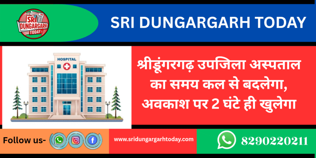 उपजिला अस्पताल श्रीडूंगरगढ़ का समय 1 अक्टूबर 2025 से बदल जाएगा। प्रभारी डॉ. एस.के. बिहानी ने बताया कि अब अस्पताल का समय प्रातः 9 बजे से दोपहर 3 बजे तक रहेगा। वहीं राजकीय अवकाश के दिन चिकित्सा सेवाएं सुबह 9 से 11 बजे तक उपलब्ध होंगी। उन्होंने सभी चिकित्सकों व कर्मचारियों को समय पर उपस्थित होने के निर्देश दिए और आमजन से नए समय अनुसार अस्पताल सेवाओं का लाभ लेने की अपील की।