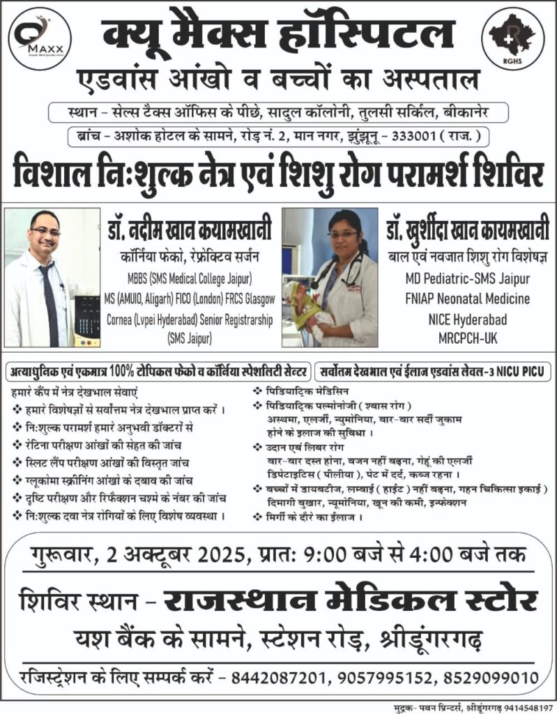 शिविर में बीकानेर के विशेषज्ञ डॉक्टर डॉ. नदीम खान कयामखानी (नेत्र रोग विशेषज्ञ) और डॉ. खुर्शीदा खान कयामखानी (शिशु रोग विशेषज्ञ) अपनी सेवाएं देंगे।