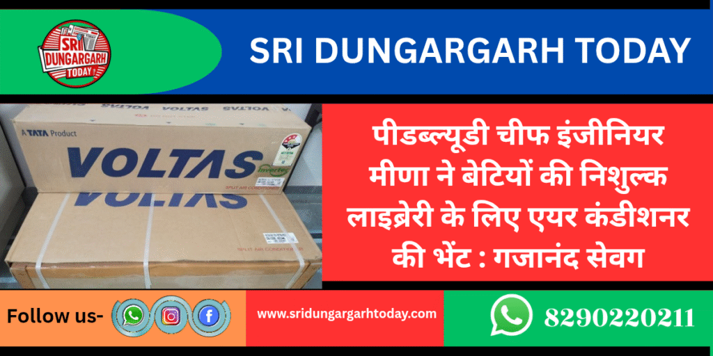 श्रीडूंगरगढ़ कस्बे की देवनारायण कॉलोनी स्थित बालिका स्वाध्याय निशुल्क लाइब्रेरी के मुख्य सलाहकार सेवानिवृत जिला शिक्षा अधिकारी गजानंद सेवग ने जानकारी देते हुए बताया। उद्घाटन समारोह पर पीडब्ल्यूडी चीफ इंजीनियर राजस्थान के हजारी लाल मीणा पुत्र श्री जमनाराम मीणा निवासी कासिमपुरा झुंझुनू द्वारा घोषणा की गई थी उस दौरान लाइब्रेरी टीम द्वारा पीडब्लयूडी चीफ इंजीनियर मीणा साहब को प्रतीक चिन्ह भेंट कर सम्मानित किया गया था जो गुरुवार सुबह लाइब्रेरी के निदेशक योगाचार्य ओम प्रकाश कालवा व संस्था चेयरमैन मंजु देवी व्यवस्थापक हरीश कुमार शर्मा संस्था संरक्षक श्रीगोपाल राठी को एक एसी भेंट कर दी गई कार्यकारिणी सदस्य नरेंद्र सिंह राजपुरोहित, सहीराम रोलण, राकेश कुमार पडिहार, दामोदर बोहरा, मनीष कुमार धामा, हरिराम सारण, रामस्वरूप प्रजापत, लाला राजस्थानी, हरि प्रसाद भादू, सोनिया राजपुरोहित पुरी टीम द्वारा पीडब्लयूडी चीफ इंजीनियर मीणा साहब का आभार व्यक्त किया। टीम प्रमुख गजानंद सेवग ने बताया संभाग की पहली निशुल्क लाइब्रेरी जिसमें क्षेत्र की जरुरतमंद बेटियों की उत्तम व्यवस्थाओं को ध्यान में रखते हुए मीणा साहब ने लाइब्रेरी कक्ष के लिए एक एयर कंडीशनर भेंट कर बहुत ही सराहनीय व पुण्य कार्य किया है। अतः संस्था सदैव इनकी आभारी रहेगी।