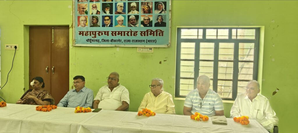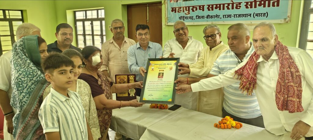 महात्मा गांधी की 156वीं जयन्ती के अवसर पर महापुरुष समारोह समिति श्री डूंगरगढ़ के तत्वावधान में शुक्रवार को “महात्मा गांधी स्मृति सम्मान” एवं शिक्षक सम्मान 2025 समारोह नागरिक विकास परिषद भवन आडसर बास श्रीडूंगरगढ़ में आयोजित हुआ। श्रीगोपाल राठी की अध्यक्षता में आयोजित इस कार्यक्रम में मुख्य अतिथि- समाजसेवी सत्यनारायण बाहेती, विशिष्ट अतिथि निर्मल कुमार पुगलिया, मुख्यवक्ता सेवानिवृत्त जिला शिक्षा अधिकारी गजानन्द सेवग मंचस्थ रहे । समिति द्वारा आयोजित इस कार्यक्रम में संस्था का प्रतिष्ठित 2025 का “महात्मा गांधी स्मृति सम्मान” गांधीवादी विचारधारा को सार्थक करने वाले समाजसेवा के क्षेत्र में विशेष योगदान देने वाले ओमप्रकाश राठी ( जीव दया गौ शाला समिति ) श्रीडूंगरगढ़ को एवं शिक्षक सम्मान 2025 अपने सेवा काल में शिक्षा के क्षेत्र में उत्कृष्ट कार्य करने वाली सेवानिवृत्त प्रधानाचार्या विद्या गुसांई को प्रशस्तिका, शॉल, प्रतीक चिहन प्रदान कर मंचस्थ अतिथियों द्वारा सम्मान से अलंकृत किया गया।