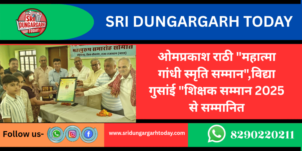 महात्मा गांधी की 156वीं जयन्ती के अवसर पर महापुरुष समारोह समिति श्री डूंगरगढ़ के तत्वावधान में शुक्रवार को “महात्मा गांधी स्मृति सम्मान” एवं शिक्षक सम्मान 2025 समारोह नागरिक विकास परिषद भवन आडसर बास श्रीडूंगरगढ़ में आयोजित हुआ। श्रीगोपाल राठी की अध्यक्षता में आयोजित इस कार्यक्रम में मुख्य अतिथि- समाजसेवी सत्यनारायण बाहेती, विशिष्ट अतिथि निर्मल कुमार पुगलिया, मुख्यवक्ता सेवानिवृत्त जिला शिक्षा अधिकारी गजानन्द सेवग मंचस्थ रहे । समिति द्वारा आयोजित इस कार्यक्रम में संस्था का प्रतिष्ठित 2025 का “महात्मा गांधी स्मृति सम्मान” गांधीवादी विचारधारा को सार्थक करने वाले समाजसेवा के क्षेत्र में विशेष योगदान देने वाले ओमप्रकाश राठी ( जीव दया गौ शाला समिति ) श्रीडूंगरगढ़ को एवं शिक्षक सम्मान 2025 अपने सेवा काल में शिक्षा के क्षेत्र में उत्कृष्ट कार्य करने वाली सेवानिवृत्त प्रधानाचार्या विद्या गुसांई को प्रशस्तिका, शॉल, प्रतीक चिहन प्रदान कर मंचस्थ अतिथियों द्वारा सम्मान से अलंकृत किया गया।