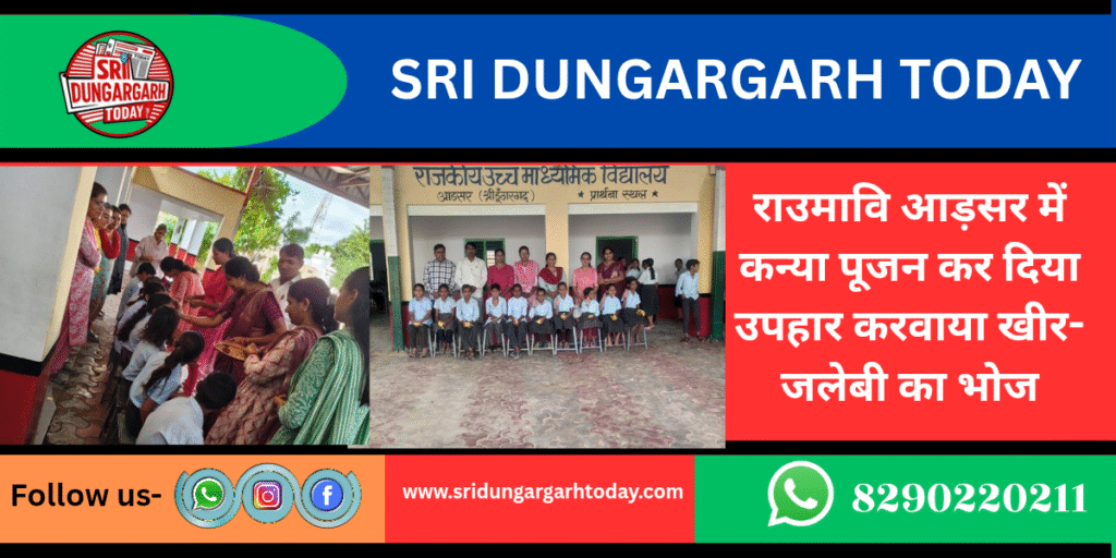 शारदीय नवरात्र के उपलक्ष्य में राजस्थान शिक्षक संघ राष्ट्रीय के आह्वान पर शरद पूर्णिमा के दिन गांव आडसर के राउमावि में कन्या पूजन का आयोजन किया गया। कार्यक्रम प्रार्थना सभा में रखा गया। जहां 11 कन्याओं का पूजन कर तिलकार्चन व रक्षा सूत्र बन्धन भी किया। शाला प्राचार्य पवन शर्मा ने माँ के नो रूपों की महिमा बताई कार्यक्रम का मुख्य उद्देश्य विद्यार्थियों में नारी शक्ति के प्रति सम्मान भाव जगाना व समाज में सुसंस्कार का संदेश देना हैं। कन्या पूजन में महिला स्टाफ प्रियंका गोदारा, सीमा कविया, सुनीता, अदिति, बिंदु, सरोज, सुमन, लोकेशी, मंजू, ज्योति सक्रिय रही। वहीं शिक्षक नेकीराम, गोवर्धन, प्रदीप, राजेश, हरलाल, रामस्वरूप ने भी कन्यापूजन किया व कार्यक्रम में सहयोगी बने शर्मा ने बताया विद्यालय के समस्त विद्यार्थियों ने शक्ति स्वरूपा कन्याओं का वंदन किया। इसके बाद मध्यांतर में कक्षा 1 से 8 के समस्त विद्यार्थियों को खीर जलेबी का भोज करवाया गया।