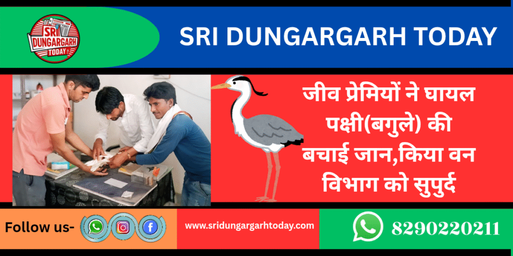 उपखंड के गांव बिरमसर में जीव प्रेमीयों ने एक घायल तटीय पक्षी की जान बचाई। युवा क्रांतिकारी संगठन के सदस्य लालचन्द गोयल ने बताया की बुधवार सुबह एक तटीय पक्षी बगुला(Egret) घायल अवस्था मे मिला जिसको बिना देर किए ABVP के पुर्व नगर मंत्री लालचन्द गोयल, कालूराम खोड व उदाराम लुखा ने घायल पक्षी को राजकीय पशु चिकित्सा उदरासर लेकर गये पशु चिकित्सक डॉ लालाराम लुखा ने प्राथमिक उपचार किया इसके ततपश्चात उपचार के बाद राजकीय पशु चिकित्सालय श्रीडूंगरगढ़ लाया गया और इलाज करवाया इसके बाद युवाओं ने सह – सुरक्षित वन विभाग को सुपुर्द कर दिया लालचंद गोयल ने युवा क्रन्तिकारी संगठन के सदस्यों का आभार जताते हुए कहा कि पशु-पक्षीयों व वन्य जीवों की सेवा करनी चाहिए ऐसे ही जीव प्रेमी होगे तो पशु पक्षी पर्यावरण को लाभ मिलता रहेगा