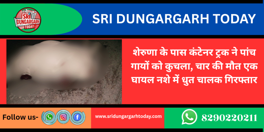 श्रीडूंगरगढ़ क्षेत्र के शेरुणा गांव में मंगलवार देर रात एक दर्दनाक हादसा हुआ। नेशनल हाईवे पर स्थित शेरुणा बस स्टैंड के पास शराब के नशे में धुत एक तेज़ रफ्तार कंटेनर ट्रक चालक ने सड़क पर बैठी पांच गायों को कुचल दिया।