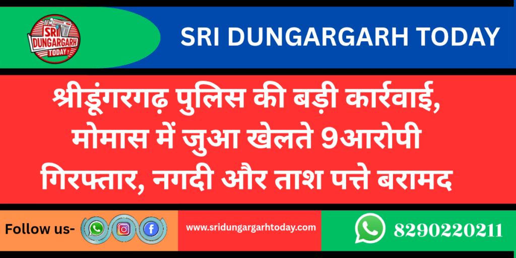 मंगलवार शाम श्रीडूंगरगढ़ पुलिस ने जुआरियों के खिलाफ कार्रवाई करते हुए नौ आरोपियों को मौके से दबोच लिया। थानाधिकारी जितेंद्र कुमार स्वामी के निर्देशन में हेड कांस्टेबल संदीप कुमार के नेतृत्व में पुलिस दल ने गांव मोमासर में छापामारी कर जुआ खेलते हुए कई लोगों को पकड़ा। पुलिस ने हंसराज मेघवाल, मोहनलाल जाट, रामूराम जाट, प्रभुराम जाट, नंदराम जाट, सोहनलाल जाट, हड़मान सिंह राजपूत, गोपालराम और दुलाराम जाट को गिरफ्तार कर थाने पहुंचाया। मौके से 52 ताश पत्ते और 5840 रुपए नगद जब्त किए गए। मामले की जांच हेड कांस्टेबल देवाराम को सौंपी गई है। पुलिस की इस कार्रवाई से क्षेत्र में हड़कंप मचा हुआ है।