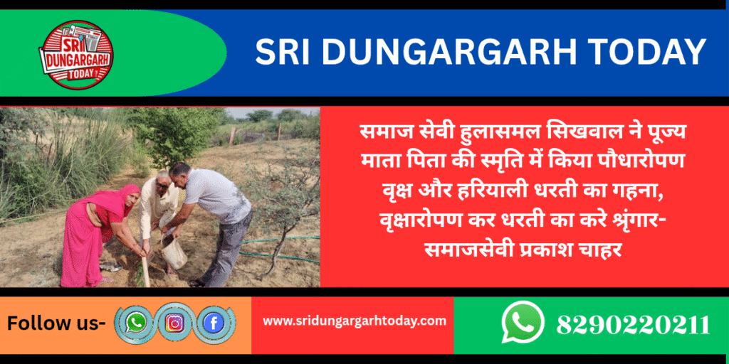 श्रीडूंगरगढ़ सरदारशहर रोड़ पर स्थित सुलोचना देवी सिखवाल की ढाणी में पौधारोपण का कार्यक्रम आयोजित किया गया। समाजसेवी हुलासमल सिखवाल ने अपनी पूज्य माताजी एवं पिताजी के स्मृति में अपनी धर्मपत्नी के साथ अर्जुन वृक्ष के पौधों का रोपण कर पर्यावरण संरक्षण का संदेश दिया। इस दौरान समाजसेवी प्रकाश चाहर ने वृक्षारोपण करते हुए अपने उद्बोधन में कहा कि वृक्ष- हरियाली धरती का गहना है, धरती को वृक्ष हीन न करें। प्रतिदिन जन्मदिन, पुण्य आत्माओं की स्मृति में खूब वृक्षारोपण कर धरती को हरा भरा करें। समाजसेवी चाहर ने इस अवसर पर कहा कि वृक्षारोपण के लिए यह उचित मौसम है इस मौसम में किया गया पौधारोपण भविष्य में वृक्ष बनेगा और हम सभी को प्राण वायु प्रदान करेगा साथ ही साथ इन्होंने कहा कि पौधारोपण करने के बाद पौधों की सुरक्षा पर ज्यादा ध्यान दें। सभी ने पौधारोपण कर उनकी सुरक्षा का संकल्प लिया।