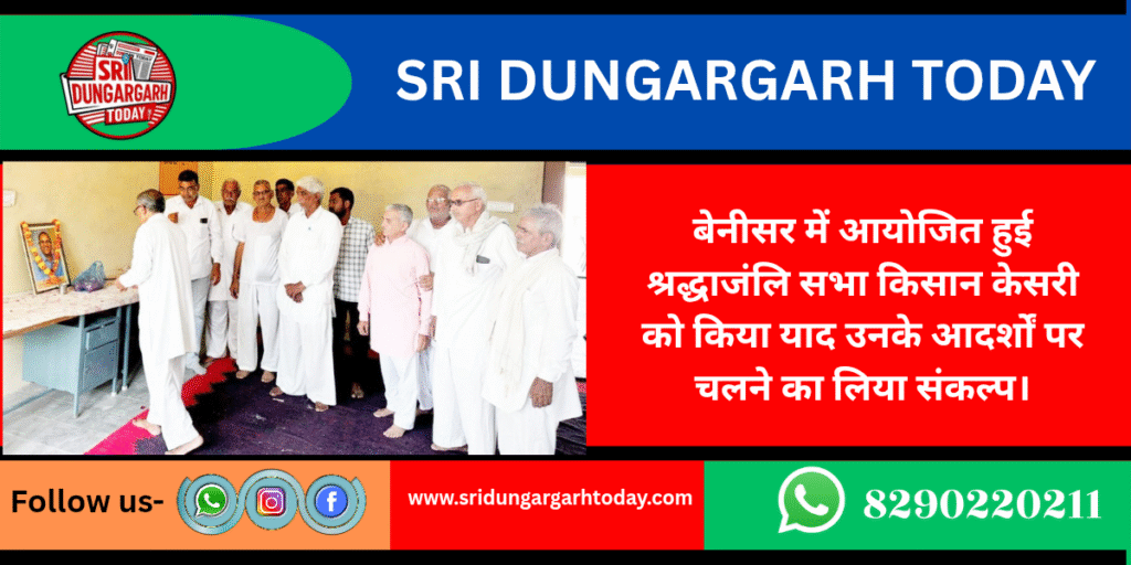 क्षेत्र के गांव बेनीसर के पंचायत भवन में रविवार सुबह 10 बजे किसान केसरी रामेश्वरलाल डूडी की स्मृति में श्रद्धाजंलि सभा का आयोजन किया गया। सभा में बड़ी संख्या में ग्रामीण व डूडी समर्थक शामिल हुए। सभी ने दो मिनिट का मौन रखा व डूडी के चित्र पर पुष्पाजंलि अर्पित की सभा में रामलाल जाखड़, जिज्ञासु सिद्ध, मघाराम सिंवर ने डूडी के राजनीतिक और सामाजिक जीवन के बारे में स्मृतियों को साझा किया। और डूडी के आदर्शों पर चलने का संकल्प लिया। सभा मे रेवंतनाथ सिद्ध,उदाराम गोदारा,जीज्ञासु सिद्ध, मघाराम सिंवर,मदननाथ सिद्ध ओमप्रकाश जाखड़,अर्जुन नायक,मुखनाथ सिद्ध,सहीराम गोदारा,श्यामलाल पोटलिया, मनोज गोदारा,अशोक डोगीवाल,राजन मुंड,किसननाथ हुड्डा,सत्यनारायण गोदारा ओमप्रकाश बेनीसर सहित अनेक ग्रामीण मौजूद रहें।
