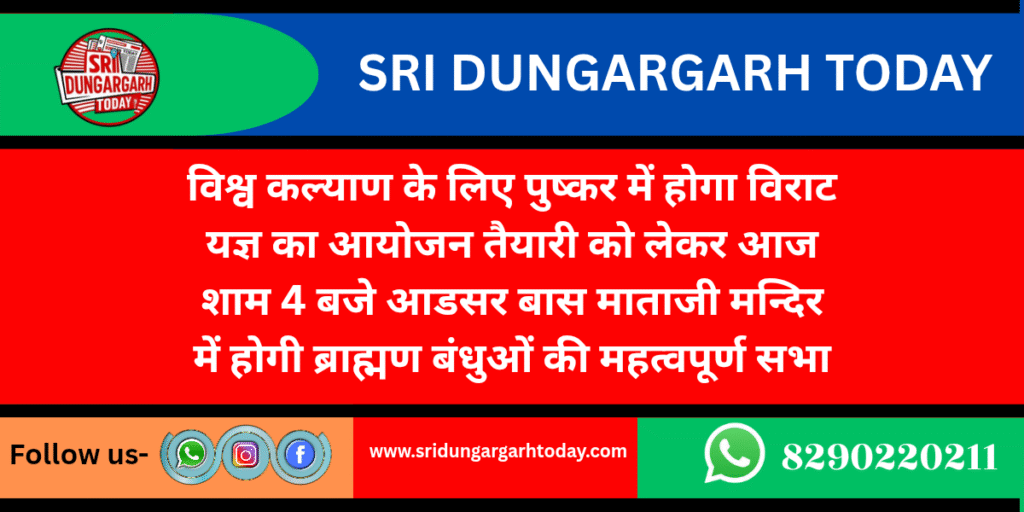 विप्र फाउंडेशन श्रीडूंगरगढ़ इकाई द्वारा आज मंगलवार शाम 4:30 बजे माता जी मंदिर, आडसर बास में ब्राह्मण बंधुओं की एक विशेष महासभा का आयोजन किया जाएगा यह सभा यज्ञ सम्राट स्वामी श्री प्रवर जी महाराज के सान्निध्य में आगामी वर्ष मार्च से अप्रैल 2026 के मध्य पुष्कर स्थित गायत्री शक्तिपीठ (मणिगंधक पीठ) पर होने वाले 200 कुण्डीय शत (100) गायत्री पुरुषोत्तम महायज्ञ की तैयारी को लेकर रखी गई है।