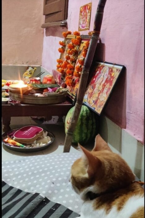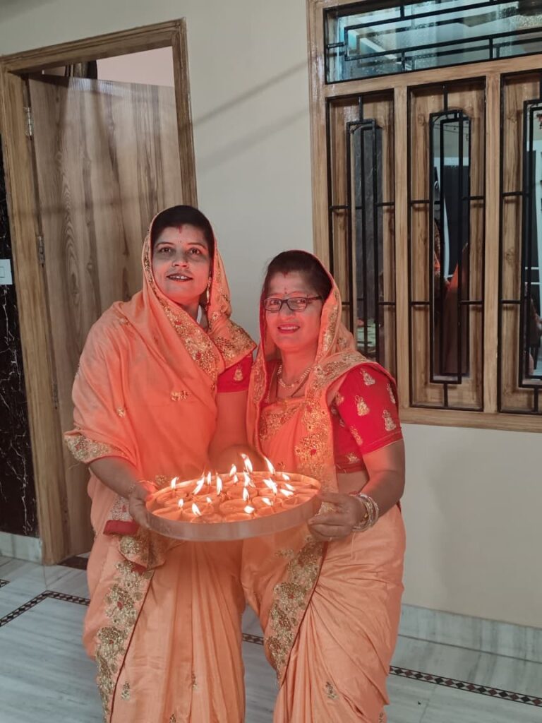 बिग्गाबास लोहिया परिवार में देवरानी जेठानी ने पूजन के बाद जलाए दीपक, मांगी खुशहाली।
