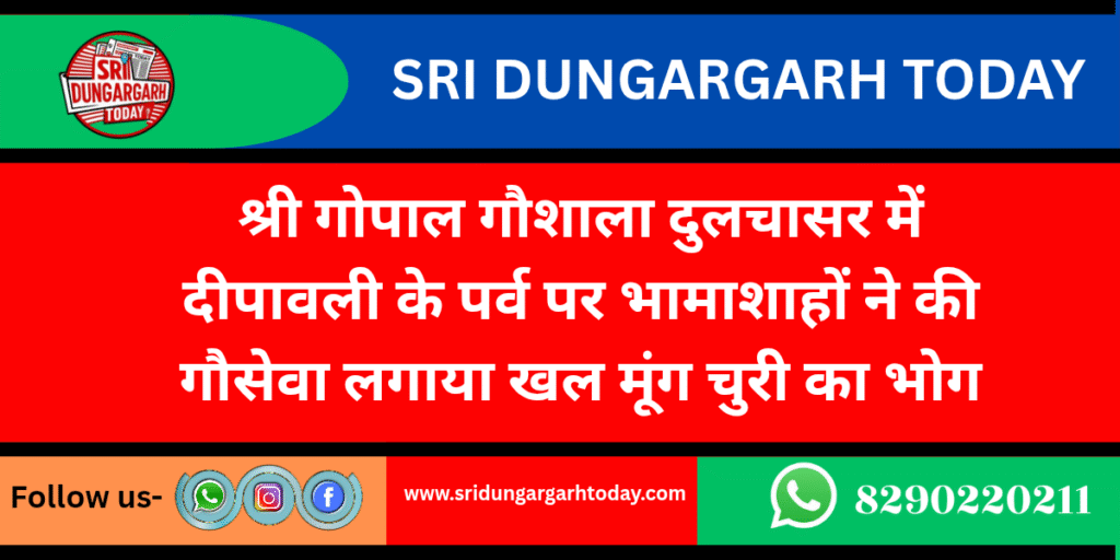 दीपावली के महापर्व के पर ठकुराइन गौरा कंवर धर्मपत्नी दिवंगत मगसिंह पड़िहार निवासी दुलचासर ने श्री गोपाल गौशाला दुलचासर की गौ माताओं को पौष्टिक आहार खल मुंगचुरी तथा गुड़ का पावन भंडारा कर गौमाता को भोग लगाया। भंडारा वितरण में उनकी पुत्रवधू ओम कंवर एवं पड़पोते रामगोपाल सिंह मनमोहन सिंह पड़िहार ने सहयोग किया। सचिव रेवन्त सिंह पड़िहार ने बताया कि वहीं बीकानेर नवयुवक मंडल, बीकानेर के द्वारा दो बोरी बिनौला खल एक बोरी मूंग चूरी समर्पित कि हैं। समस्त दानदाताओं का गौशाला कमेटी ने आभार व्यक्त कर ईश्वर से सुख समृद्धि की कामना की।