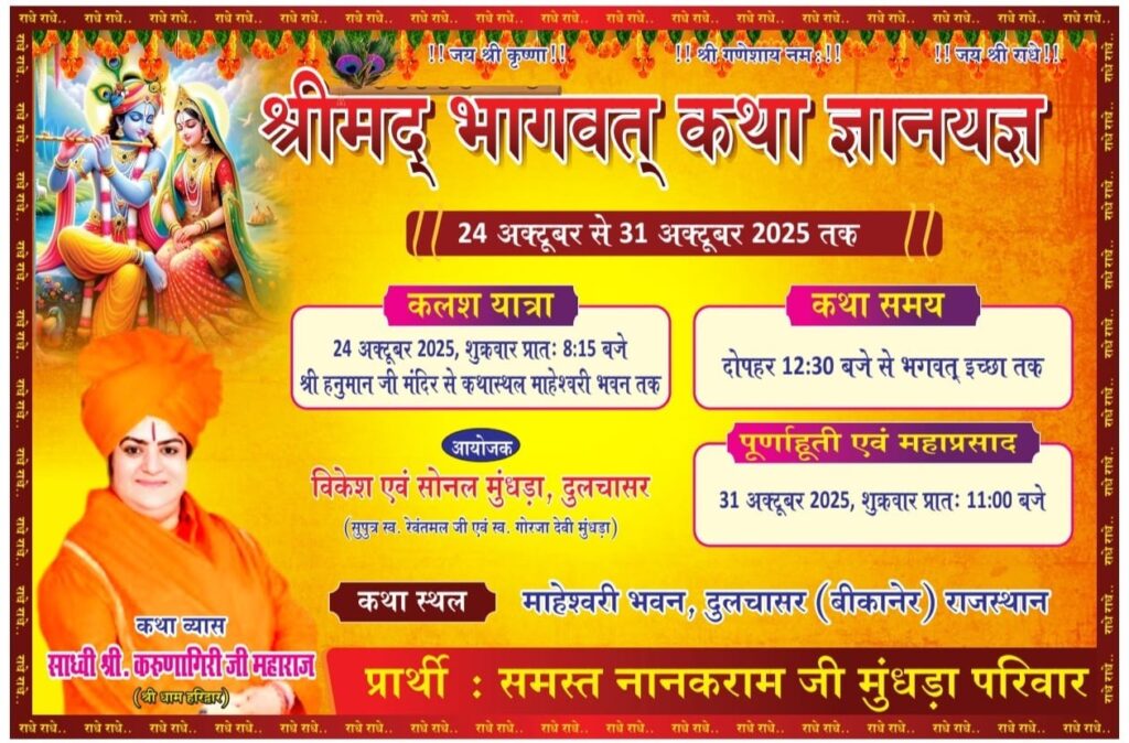 दुलचासर में कल 24 अक्टूबर को संगीतमय श्रीमद् भागवत कथा का होगा भव्य आयोजन महामंडलेश्वर करूणागिरिजी महाराज के श्रीमुख से होगा कथा का वाचन