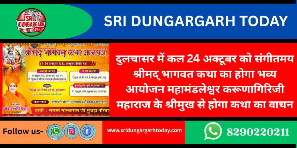 दुलचासर में कल 24 अक्टूबर को संगीतमय श्रीमद् भागवत कथा का होगा भव्य आयोजन महामंडलेश्वर करूणागिरिजी महाराज के श्रीमुख से होगा कथा का वाचन