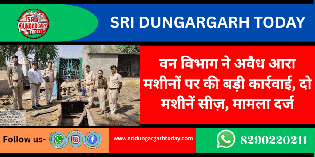 वन विभाग श्रीडूंगरगढ़ की टीम ने सहायक वन संरक्षक सत्यपाल सिंह की अगुवाई में गुरूवार को अवैध रूप से संचालित आरा मशीनों के खिलाफ एक बड़ा अभियान शुरू किया। इस क्रम में, माताजी मोड़ नौसरिया इलाके में चल रही दो अवैध आरा मशीनों को सीज़ कर संबंधित व्यक्तियों के खिलाफ मामला दर्ज किया सहायक वन संरक्षक सत्यपाल सिंह ने जानकारी देते हुए बताया कि वन विभाग को पिछले कई दिनों से क्षेत्र के कुछ स्थानों पर अवैध रूप से आरा मशीनों के संचालन की सूचना मिल रही थी। सूचना की पुष्टि के उपरांत, वन विभाग की टीम ने एक योजनाबद्ध तरीके से गुरुवार को माताजी मोड़ नौसरिया में दबिश दी। इस दौरान, काना राम पुत्र शेरा राम एवं सुरेंद्र पुत्र बिँझा राम के घरों पर अवैध रूप से चल रही दो आरा मशीनों को सीज़ किया गया। सत्यपाल सिंह बताया स्पष्ट किया कि वन विभाग द्वारा इस प्रकार की कार्यवाहियां आगे भी निरंतर जारी रहेंगी। इसके साथ ही, विभाग अवैध आरा मशीनों के साथ-साथ अवैध रूप से लकड़ी के भंडारण (स्टॉक) पर भी सख्त कार्रवाई करेगा।