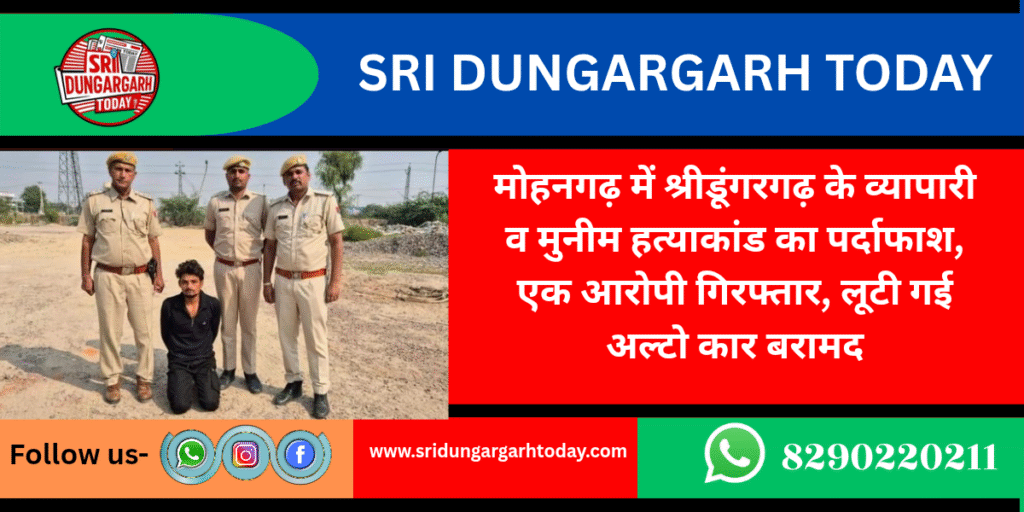 जिला पुलिस अधीक्षक अभिषेक शिवहरे के निकटतम निर्देशन में पुलिस ने मोहनगढ़ हल्का क्षेत्र में बीकानेर के व्यापारी और उसके मुनीम की निर्मम हत्या के मामले में त्वरित एवं प्रभावी कार्रवाई करते हुए बड़ी सफलता हासिल की है। पुलिस ने एक आरोपी को गिरफ्तार कर हत्या के बाद लूटी गई अल्टो कार बरामद कर ली है, वहीं शेष आरोपियों की तलाश के लिए टीमें लगातार दबिश दे रही हैं।