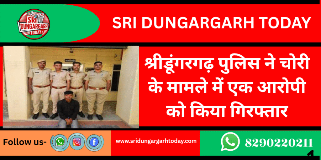 श्रीडूंगरगढ़ पुलिस ने गांव मोमासर में हुई एक चोरी के प्रकरण में आरोपी को गिरफ्तार किया है। थानाधिकारी जितेंद्र कुमार के अनुसार गांव मोमासर में 8 मई 2025 की रात जेठीदेवी पत्नी भंवराराम मेघवाल के घर चोरी की वारदात को अंजाम देने वाला इसी गांव का 20 वर्षीय आरोपी कालूराम पुत्र गंगाराम मेघवाल है, जिसे पुलिस ने गिरफ्तार कर लिया है। आरोपी को गिरफ्तार करने वाली टीम में हैड कांस्टेबल रामस्वरूप सहित टीम सक्रिय रही। पुलिस ने बताया कि मामले की जांच अभी जारी है।