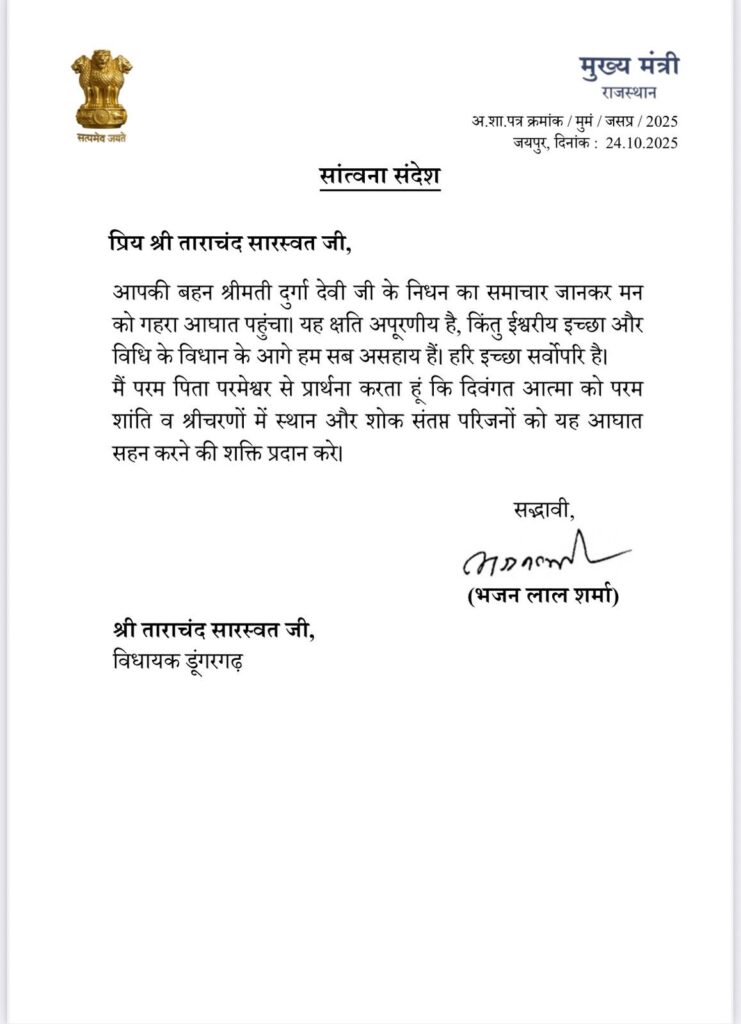 मुख्यमंत्री भजनलाल शर्मा ने शोक संदेश पत्र प्रेषित कर विधायक ताराचंद सारस्वत परिवार के प्रति गहरी संवेदना जताई है।