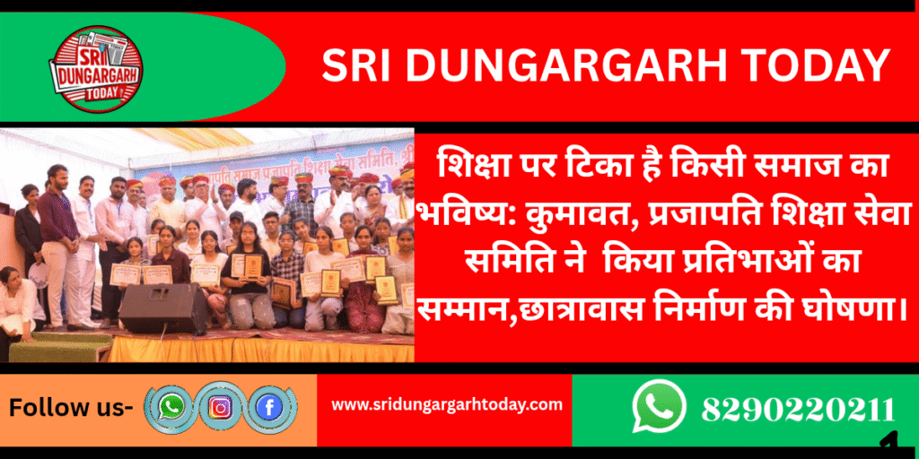 प्रजापति समाज के छात्रावास स्थल पर आयोजित इस कार्यक्रम में मंत्री कुमावत ने प्रजापति समाज को एक मंच पर लाने के लिए आयोजकों का आभार जताया। उन्होंने समाज के युवाओं को शिक्षा के क्षेत्र में कड़ी मेहनत करने की बात कही। उन्होंने कहा कि समय की आवश्यकता को देखते हुए, जमाने के साथ चलने के लिए बेटियों को भी उच्च शिक्षित करना होगा। मशीनी युग में उच्च और तकनीकी शिक्षा की कमी रहेगी तो समाज पिछड़ा रह जाएगा। समाज के पुरोधा समाज के युवाओं को उच्च शिक्षा के लिए प्रोत्साहित करें।