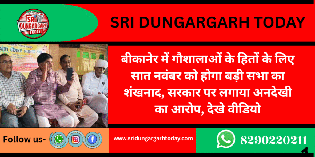 बीकानेर गौशाला संघ के द्वारा आज तुलसी सर्किल पर सात नवंबर को होने वाले संभाग स्तरीय गौशाला संचालकों की विशाल सभा के लिए प्रेस वार्ता व बैठक का आयोजन बीकानेर गोशाला संघ के उपाध्यक्ष सत्यनारायण स्वामी की अध्यक्षता में किया गया गया।
