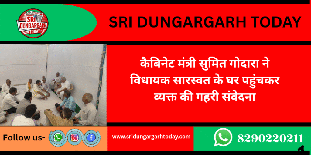 श्रीडूंगरगढ़ विधायक ताराचंद सारस्वत की बहन दुर्गा देवी के आकस्मिक निधन पर राजस्थान सरकार में खाद्य एवं नागरिक आपूर्ति तथा उपभोक्ता मामलों के कैबिनेट मंत्री सुमित गोदारा ग्राम गुसांईसर बड़ा पहुंचे। मंत्री गोदारा ने विधायक सारस्वत एवं शोकाकुल परिवार से मुलाकात कर गहरी संवेदना व्यक्त की। उन्होंने कहा कि दुर्गा देवी का निधन परिवार एवं समाज दोनों के लिए अपूरणीय क्षति है।मंत्री गोदारा ने ईश्वर से दिवंगत आत्मा की शांति तथा परिजनों को धैर्य और शक्ति प्रदान करने की प्रार्थना की।