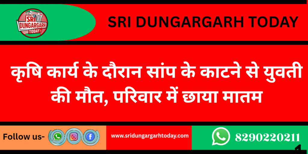 श्रीडूंगरगढ़ क्षेत्र के धीरदेसर चोटियांन में रविवार को एक दिल दहला देने वाली घटना सामने आई है घटना 19 अक्टूबर दोपहर 3 बजे की है। जहां खेत में कृषि कार्य के दौरान सांप के काटने से एक युवती की मौत हो गई। मिली जानकारी के अनुसार कुनपालसर निवासी पूजा खेत में काम कर रही थी। इसी दौरान अचानक एक कोबरा सांप ने उसे काट लिया। परिजन उसे तुरंत उपचार के लिए ले गए, लेकिन अधिक ज़हर फैल जाने के कारण उसकी जान बचाई नहीं जा सकी। युवती  के पिता लालूराम पुत्र रामूराम नायक ने श्रीडूंगरगढ़ थाने में मर्ग रिपोर्ट दर्ज करवाई। पुलिस ने रिपोर्ट के आधार पर मामला दर्ज कर आगे की कार्रवाई शुरू कर दी है।