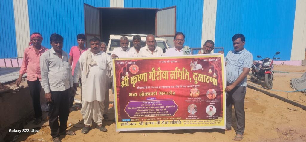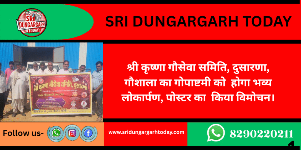 श्रीकृष्णा गौसेवा समिति दुसारणा का गोपाष्टमी के पावन पर्व पर 30 अक्टूबर 2025 को संतो के कर कमलों से भव्य लोकार्पण समारोह होगा 30 अक्टूबर सुबह 10 बजे से हवन अनुष्ठान व 11 बजे वैदिक मंत्रोचार संतो का पुष्प वर्षा कर भव्य स्वागत समारोह व 11:30 बजे भव्य लोकार्पण होगा तथा 12.15 बजे गौपूजन व के साथ गौमाताओं का गौशाला में प्रवेश होगा तथा दोपहर 1 बजे से समारोह में शामिल होने वाले संतो के प्रवचन व सत्संग प्रारंभ होगा। समारोह में बीकानेर से दाताश्री रामेश्वरानंद जी महाराज, कोलायत से सत्यानंद जी महाराज, ब्रह्म गायत्री सेवाश्रम सागर से आशीषजी महाराज व नापासर से पंडित प्रकाश तिवाड़ी शामिल होंगे। समिति सदस्यों द्वारा आयोजन के प्रचार प्रसार हेतु सोमवार को पोस्टर का विमोचन किया गया।इस दौरान गौशाला अध्यक्ष मोहनराम गोदारा, भामाशाह पेमाराम गोदारा, समिति के रामप्रताप सारण, मैनेजमेंट टीम के सदस्य रामप्रताप गोदारा, सांवरदास, भागीदास, कालूराम सुथार, रूघाराम मूंड दुसारणा पीपासरिया सहित अनेक ग्रामीण शामिल हुए। समिति सदस्यों ने गौभक्तों व श्रद्धालुओं से समारोह में शामिल होने का आह्वान किया है।