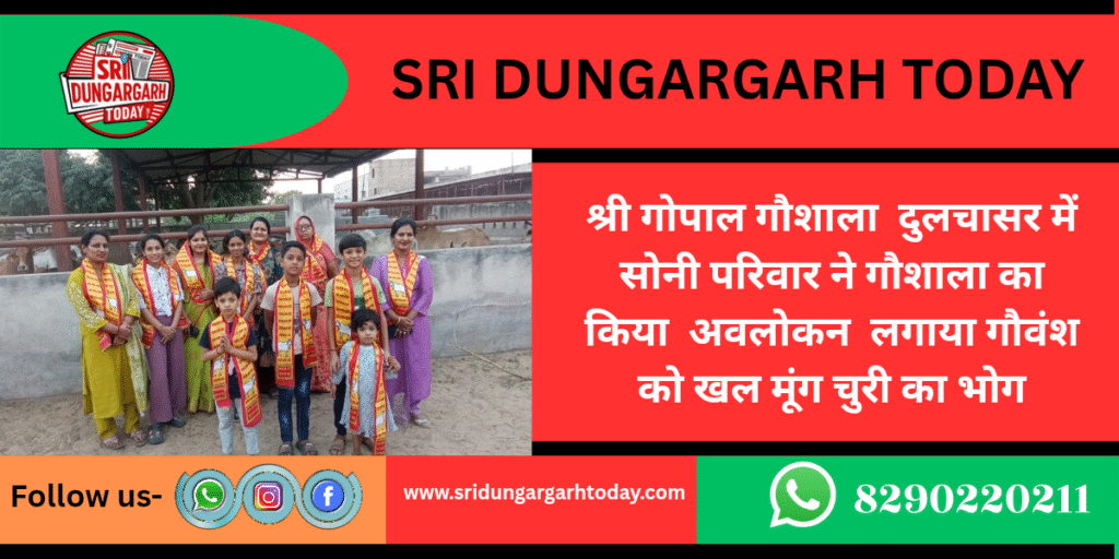 श्री गोपाल गौशाला दुलचासर में मंगलवार को संगीता देवी धर्मपत्नी सुरेंद्र कुमार सोनी निवासी मगरासार प्रवासी अहमदाबाद अपनी माताजी सावित्री देवी बहन,उषा,कविता कनिष्क,लक्ष्य,रूद्र,मानवी,भाभी डिंपल मुंधड़ा निवासी दुलचासर के साथ गौशाला में पधारकर गौशाला की गौमाताओं को खल मुंग चूरी तथा गुड़ का पावन भंडारा का भोग लगाया तथा भंडारा वितरण में मगराज मुंधड़ा निवासी दुलचासर ने सहयोग किया। सचिव रेवंत सिंह पडिहार ने बताया की संगीता देवी सोनी परिवार ने ₹ 4100 की पावन राशि भी समर्पित की। गौशाला कमेटी ने आभार व्यक्त करते हुए ईश्वर से मंगल कामना की।