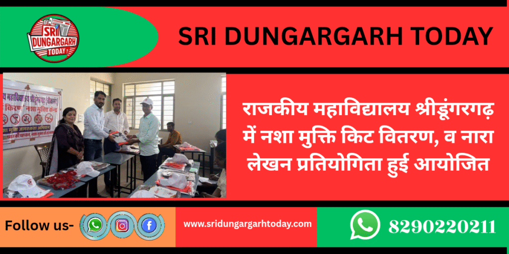 किरण नशा मुक्ति अभियान के तहत राजकीय महाविद्यालय श्रीडूंगरगढ़ में नशा मुक्ति किट वितरण व नारा लेखन प्रतियोगिता का आयोजन हुआ। कार्यक्रम में सखा-सखी टीम के 10 विद्यार्थियों को डायरी, बॉलपेन, बैग, टी-शर्ट और जैकेट सहित नशा मुक्ति किट वितरित की गई।