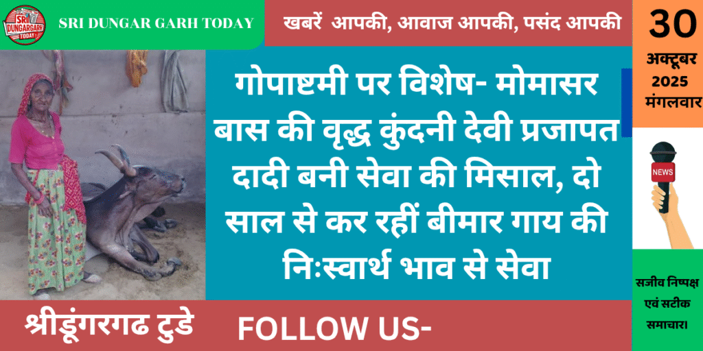 गोपाष्टमी के अवसर पर श्रीडूंगरगढ़ कस्बे के मोमासर बास की वृद्ध कुंदनी देवी प्रजापत आज एक अनोखी मिसाल बन गई हैं। करीब दो साल पहले उन्हें एक बीमार असहाय अवस्था मे मिली थी जो न ही चल सकती थी नही दूध देती थी फिर भी इस वृद्ध दादी ने गौमाता की सेवा का संकल्प लिया इसे गोशाला भेज दो”, लेकिन दादी का जवाब हमेशा एक ही रहा कि “मेरे जीते जी कोई मुझे इस गौमाता से अलग नहीं कर सकता।”