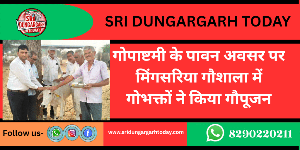 गांव मिंगसरिया की राधा कृष्ण गौशाला में गोपाष्टमी के अवसर पर ग्रामीणों ने कामधेनू पूजा का आयोजन कर गांव में सुख समृद्धि की कामना की। गौशाला समिति के अध्यक्ष नेमाराम प्रजापत ने बताया कि कामधेनू पूजन पुजारी तिलोकदास महाराज द्वारा विधि विधान से संपन्न करवाई गई जिसमें मंत्री विजय सिंह, उपाध्यक्ष रामलाल पूनियां, रामलाल गोदारा, संदीप सिंह मिंगसरिया, दिलीपसिंह हंसावत सहित अनेक ग्रामीण शामिल हुए। सभी ने गौसेवा का संकल्प लिया।