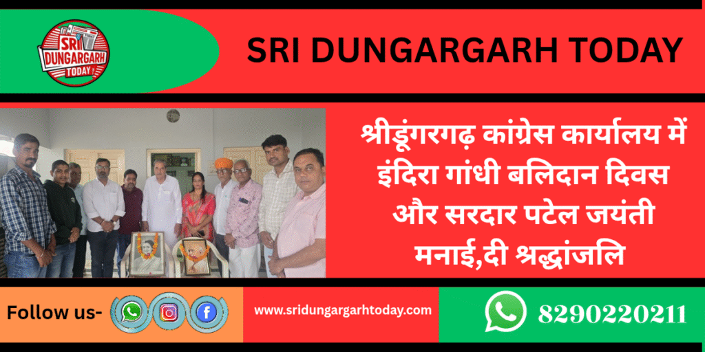 श्रीडूंगरगढ़ कांग्रेस कार्यालय में पूर्व प्रधानमंत्री इंदिरा गांधी के बलिदान दिवस और देश के प्रथम गृह मंत्री सरदार वल्लभभाई पटेल की जयंती पर पूर्व विधायक मंगलाराम गोदारा नेतृत्व में मनाई गई।