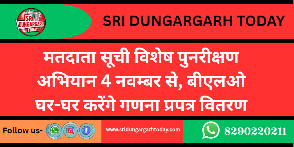 भारत निर्वाचन आयोग के निर्देशानुसार विधानसभा श्रीडूंगरगढ़ क्षेत्र में विशेष गहन पुनरीक्षण कार्यक्रम 2025 के तहत मतदाता सूची का व्यापक सत्यापन एवं अद्यतन कार्य प्रारंभ होने जा रहा है। यह अभियान 4 नवम्बर से 4 दिसम्बर 2025 तक चलेगा, जिसके दौरान बूथ लेवल अधिकारी (BLO) घर-घर जाकर गणना प्रपत्र वितरित करेंगे और उन्हें भरवाकर वापस लेंगे।