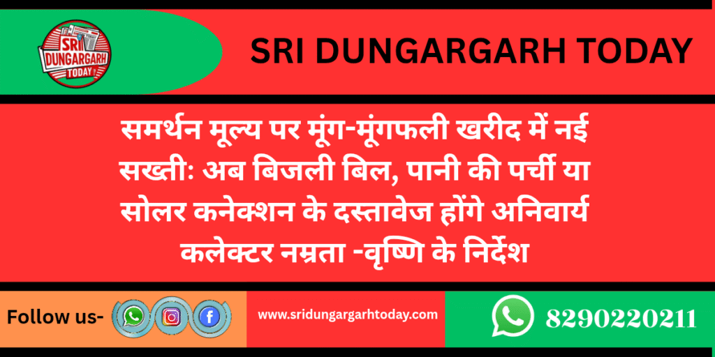 जिला कलेक्टर ने पत्र में लिखा है कि जिले में आगामी दिनों में मूंग-मूंगफली की समर्थन मूल्य खरीद शुरू होने जा रही है। जिले में समर्थन मूल्य खरीद हेतु राजफैड द्वारा हुए पंजीयनों / टोकनों के संबंध में विभिन्न स्रोतो से प्राप्त शिकायतों और आपत्तियों के मध्यनजर निर्देशित किया जाता है कि “कृषक जब खरीद केन्द्र पर विक्रय हेतु अपनी जिंस लेकर आता है, तब राजफैड के निर्देशानुसार पंजीयन संबंधी दस्तावेजों के भौतिक सत्यापन के साथ ही कृषक की पानी की पर्ची/ बिजली बिल / सोलर कनेक्शन के दस्तावेज भी संबंधित कृषक से तुलाई के समय मंगवाये जाएं तथा सत्यापन उपरांत ही तुलाई करके इनका रिकॉर्ड समिति पर संधारित रखा जाए।