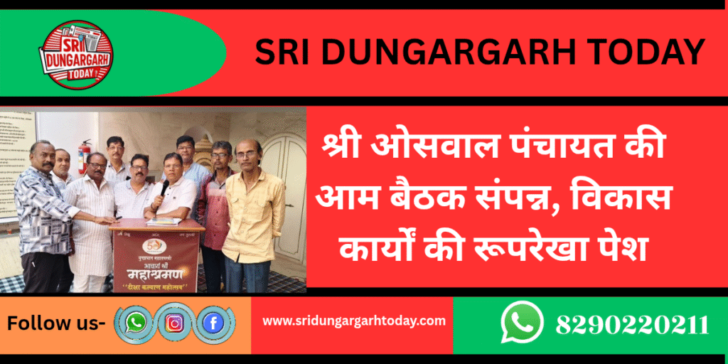 श्रीडूंगरगढ़। कालूबास स्थित जैन मंदिर परिसर में गुरुवार को श्री ओसवाल पंचायत की आम सभा सामंजस्यपूर्ण माहौल में संपन्न हुई। बैठक में समाज के भवनों सहित विविध विकासात्मक गतिविधियों का ब्यौरा प्रस्तुत किया गया।