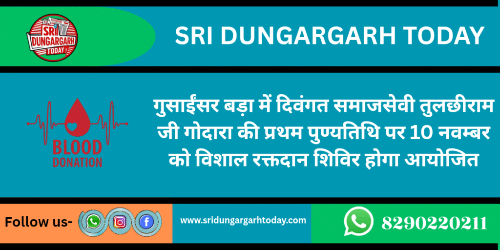 क्षेत्र के गांव गुसाईंसर बड़ा में आगामी 10 नवम्बर को विशाल रक्तदान शिविर का आयोजन होगा शिविर को तैयारियां शुरू हो गई। दिवंगत समाज सेवी तुलछीराम जी गोदारा  की प्रथम  पुण्य तिथि पर गोदारा परिवार एंव समस्त ग्राम वासियों की और से विशाल रक्तदान शिविर का आयोजन होगा शिविर गांव के पुस्तकालय भवन (मुख्य गुवाड़)  में  सुबह 10 बजे से दोपहर को 3 बजे तक आयोजित होगा  उत्तर पश्चिम रेलवे मजदूर संघ की रतनगढ़ शाखा के सचिव सीताराम गोदारा  ने गांव सहित क्षेत्र के  युवाओं से अपील की इस पुण्य कार्य (रक्तदान शिविर) में अपना अमूल्य समय निकाल कर ज्यादा से ज्यादा संख्या में भाग लेकर इस शिविर को सफल बनाए आपका दिया रक् अनेकों जिंदगीया  बचा सकता है। अधिक जानकारी ले लिए आप नीचे दिए गये नम्बरों पर सम्पर्क कर सकते है।