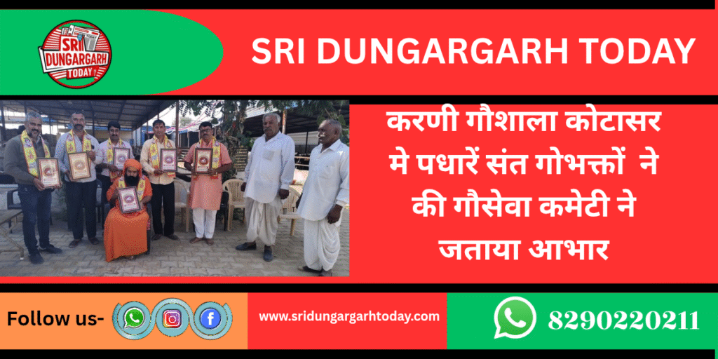 श्री करणी गो सेवा समिति गौशाला कोटासर में शनिवार को संत श्री दुर्गेश जी महाराज (ऋषिकेश),आश्रम भानेका गांव दौरान साथ मे भंवरलाल पंचारिया,जसराज पंचारिया भानेका गांव गौशाला प्रांगण में पधारें इस अवसर पर भंवरलाल पंचारिया ने ₹1100 की राशि समर्पित कर गौ सेवा को सौभाग्य प्राप्त किया। महावीर प्रसाद पानेचा दुलचासर ने 1101 रुपए की राशि प्रदान कर गौ सेवा को सौभाग्य प्राप्त किया इस दौरान कमल किशोर पानेचा ओम प्रकाश जाजड़ा भी उपस्थित रहें। दुलचासर गौशाला कमेटी के माल सिंह राठौड़, अगरसिंह पड़िहार, मालचंद जोशी ने संतों का एवं भामाशाहों को दुपट्टा पहनाकर गौशाला स्मृति चिन्ह भेंट कर सम्मानित किया तथा कमेटी ने सभी का आभार जताया।