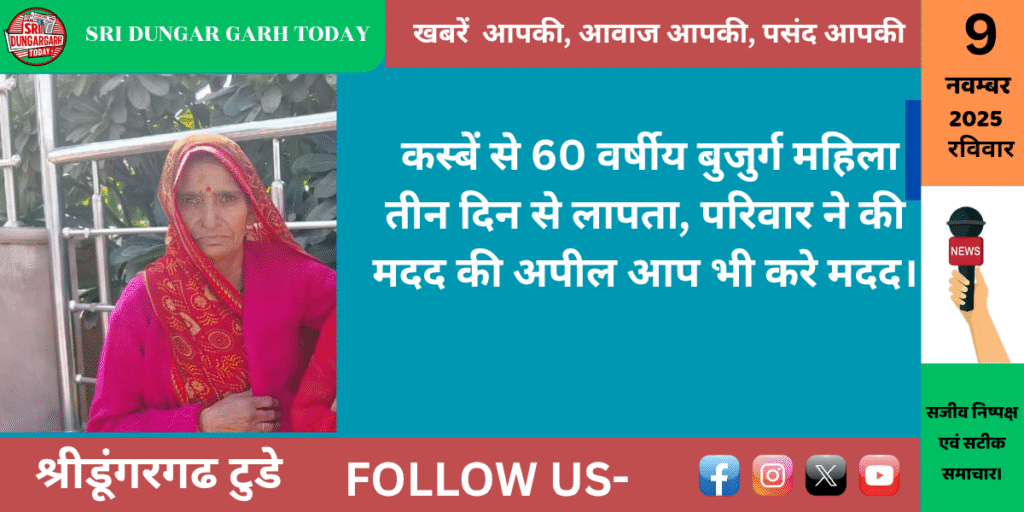 श्रीडूंगरगढ़ कस्बें से  60 वर्षीय एक बुजुर्ग महिला तीन दिन से घर से लापता है। परिजन उनकी तलाश कर रहें है व सभी पाठको से मदद की अपील की है। कालूबास निवासी रामनारायण जोशी की पत्नी भगवती देवी 6 नवंबर 2025 को अपने घर से मालकसर जाने के लिए निकली। वे मालकसर भी नहीं पहुंची और कालूबास भी लौट कर नहीं आई। परिजनों ने बताया बुजुर्ग महिला भूलने की बीमारी से ग्रसित है और संभवत भूलवश कहीं भटक गई है। परिजनों ने सभी पाठकों से बुजुर्गा के कहीं नजर आने पर 9509834525 या 9950268872 पर तुरंत सूचना देने की अपील की है।