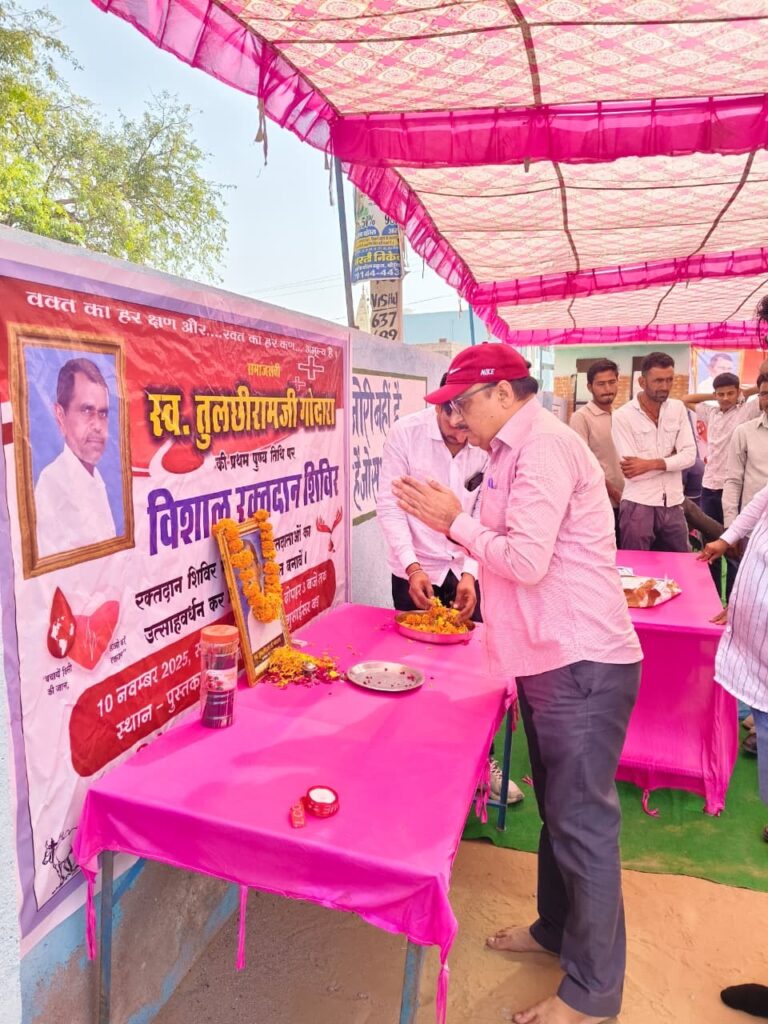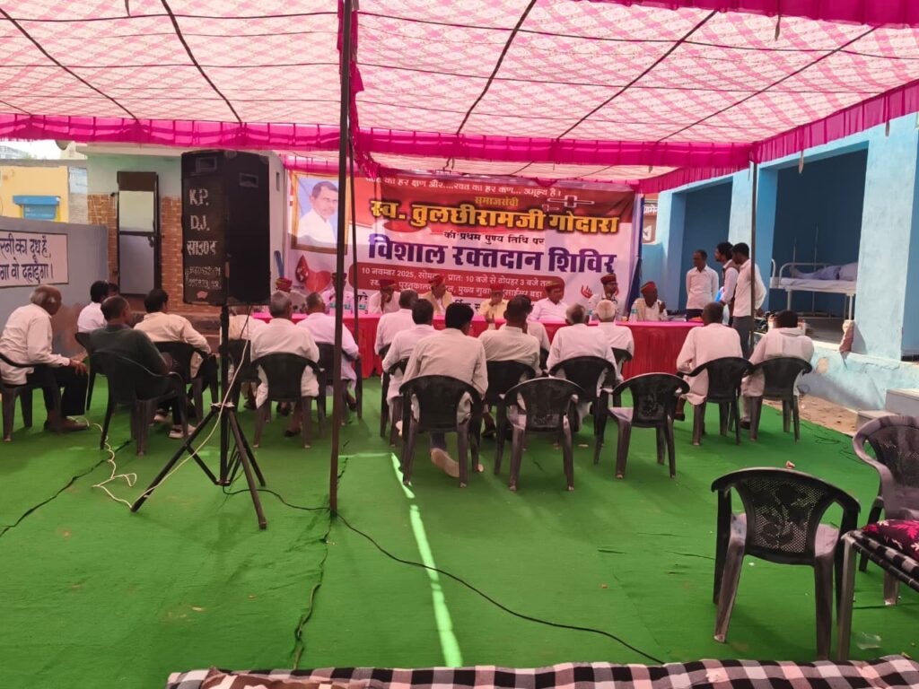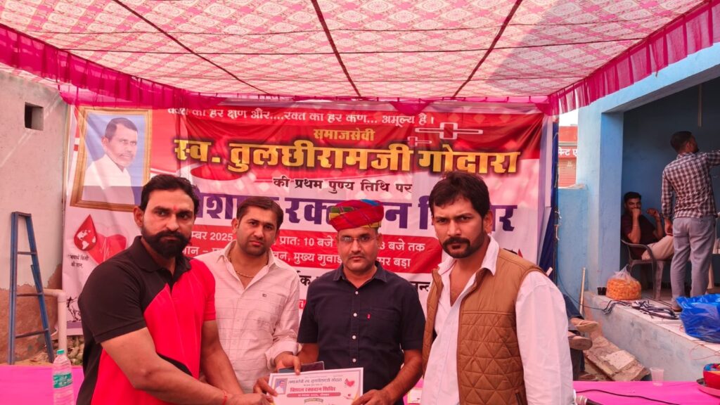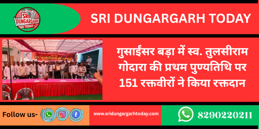 क्षेत्र के गांव गुसाईंसर बड़ा में दिवंगत तुलसीराम गोदारा की प्रथम पुण्यतिथि पर सोमवार को विशाल रक्तदान शिविर का आयोजन किया गया। शिविर में 200 से अधिक युवा रक्तदाताओं ने रक्तदान के लिए पंजीयन करवाया जिसमें पीबीएम की रक्तसंग्रहण टीम द्वारा सुबह 9 बजे दोपहर 3.30 बजे तक 151 यूनिट रक्त लिया गया। इससे पूर्व दिवंगत तुलसीराम गोदारा की प्रथम पुण्यतिथि पर आयोजित शिविर उन्हें श्रद्धाजंलि देकर शिविर शुरू हुआ
