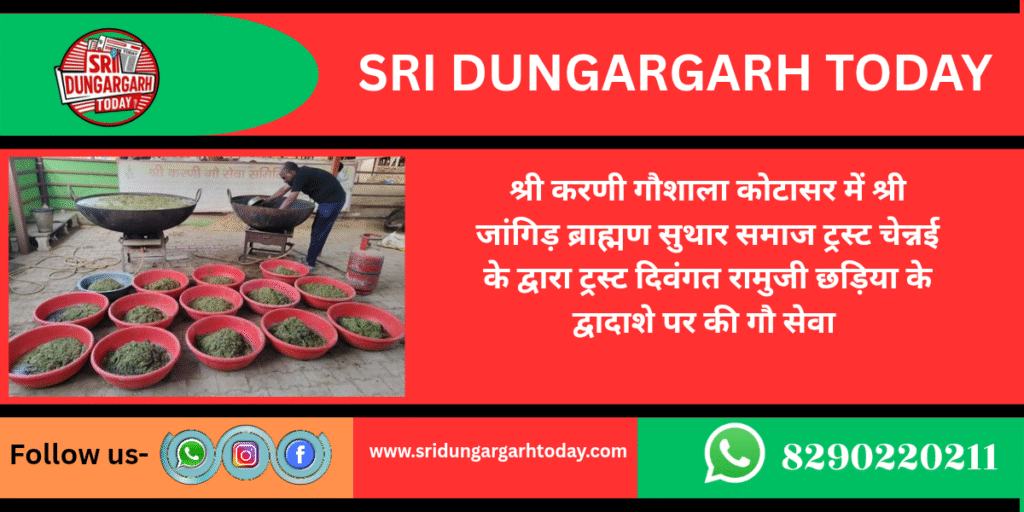 श्री जांगिड़ ब्राह्मण सुथार समाज ट्रस्ट चेन्नई के रहे वरिष्ठ सलाहकार गोलोक वासी दिवंगत रामुजी छड़िया सुथार पुत्र दिवंगत गेनाराम छड़िया सुथार कुचोर अगुणी का अकस्मात देवलोक गमन हो जाने पर उनके द्वादशे पर सोमवार को श्री जांगिड़ ब्राह्मण सुथार समाज ट्रस्ट चेन्नई के द्वारा श्री करणी गो सेवा समिति कोटासर गौशाला की गौ माताओं को गौ ग्रास के रूप में भंडारा एवं एक ट्रॉली मूंगफली चारा गौ माताओं को समर्पित कर आत्म शांति की कामना करते हुए श्रध्दा सुमन अर्पित किए। ट्रस्ट ने बताया कि स्वर्गीय रामुजी छड़िया लंबे समय तक श्री जांगिड़ ब्राह्मण सुथार समाज ट्रस्ट चेन्नई के वरिष्ठ सलाहकार रहे समय समय पर ट्रस्ट का मार्गदर्शन किया। गौशाला कमेटी आपकी आत्मा शांति की कामना करते हुए श्रद्धा सुमन अर्पित कर भगवान से प्रार्थना करती हैं कि ईश्वर अपने श्री चरणों में जगह दें।