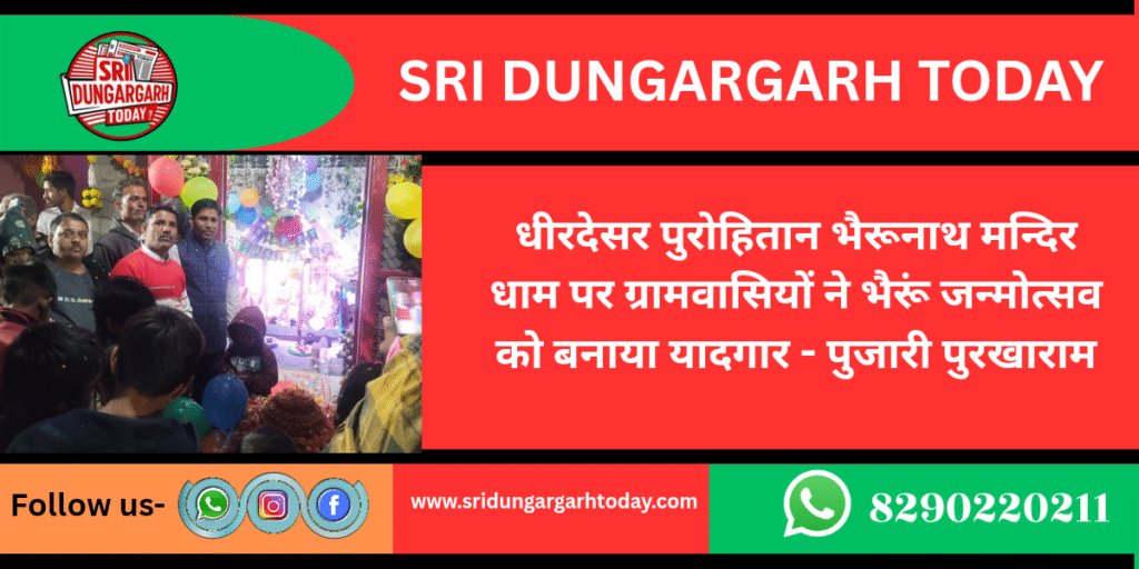 श्रीडूंगरगढ़ ( बीकानेर ) । काला गोरा भैरूं नाथ मंदिर धीरदेसर पुरोहितान के पुजारी पुरखाराम कालवा ने जानकारी देते हुए बताया कि हर साल की भांति इस वर्ष भी भैरूं जी महाराज का जन्मदिन ग्रामवासियों ने केक काटकर बड़े उत्सव ओर धूमधाम से मनाया। राष्ट्रीय योग क्रांति अभियान के राष्ट्रीय प्रभारी ख्याति प्राप्त योगाचार्य ओम प्रकाश कालवा और उनकी योगा टीम भी जन्मोत्सव कार्यक्रम में शामिल हुए मंदिर समिति के व्यवस्थापक रतन लाल कालवा ने बताया अधिक संख्या में ग्रामवासियों ने जन्मोत्सव को यादगार बनाया इस दौरान डीजे और पटाखे नाच गानों के साथ सेलिब्रेट किया इस दौरान नरसाराम कालवा, प्रकाश तातेड, विनोद डागा, बाबू राजपूत, लूण सिंह राजपुरोहित, राकेश ठुकरियासर, प्रकाश नाई, जीतू सुथार, निराण, नरेंद्र, राजन स्वामी, कुलदीप नाई, किशन नाई, अनिल कालवा, योगानंद, योगिता, प्रियंका, प्रेरणा, भावना, जगत, शीतल, मंजु, सुमन, शांति देवी, अनीता, कौशल्या, भगवानी, मीनाक्षी, ममता, सीमा, सुलोचना व समस्त ग्रामवासी