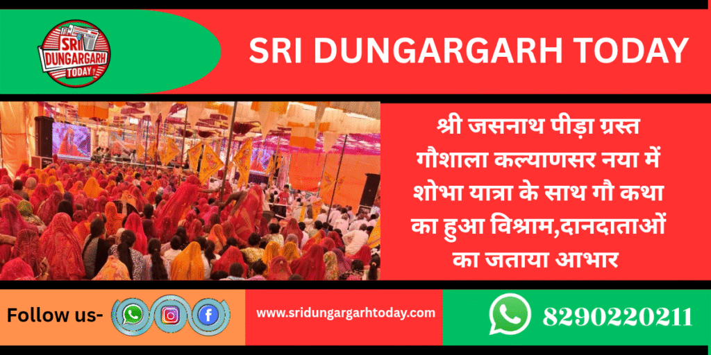 गांव कल्याणसर नया में आयोजित गौ कथा का गुरुवार शोभायात्रा के साथ समापन हुआ शोभा यात्रा गौशाला से रवाना हुई जो गांव के मुख्य मार्गो से होते हुए ठाकुर जी मंदिर पहुंची शोभा यात्रा में ढोल नगाड़ा एवं डीजे पर नाचते गाते हुए श्रद्धालुओ ने खूब आनंद लिया।