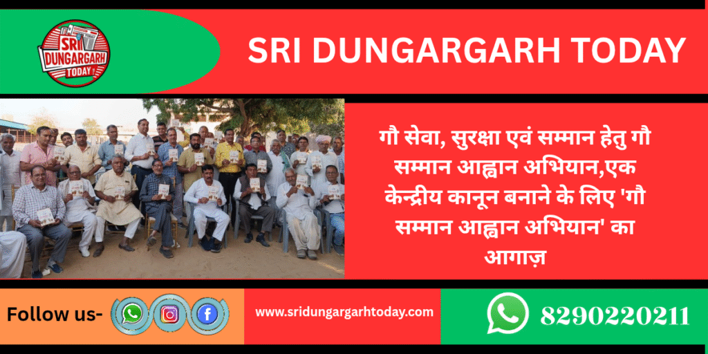 श्रीडूंगरगढ़ कस्बे के गोपाल गौशाला प्रांगण में शुक्रवार को गौ सम्मान आह्वान अभियान के निमित्त बैठक आयोजित की गई। बैठक में उपस्थित संतों, गो भक्तों और गो सेवकों ने सर्वसम्मति से निर्णय लिया गया कि यह अभियान किसी संस्था, संगठन या राजनीतिक दल के बैनर तले नहीं, बल्कि गौमाता के प्रधान संरक्षण और नंदी बाबा की अध्यक्षता में संचालित होगा। बैठक में उपस्थित संतों और गो सेवकों ने एक स्वर में कहा कि इस अभियान का उद्देश्य गौमाता को राष्ट्रमाता का दर्जा दिलाना, गौहत्या पर पूर्ण प्रतिबंध लागू करवाना और गो संवर्धन एवं उनके संरक्षण के लिए ठोस सरकारी नीतियां बनवाना है।