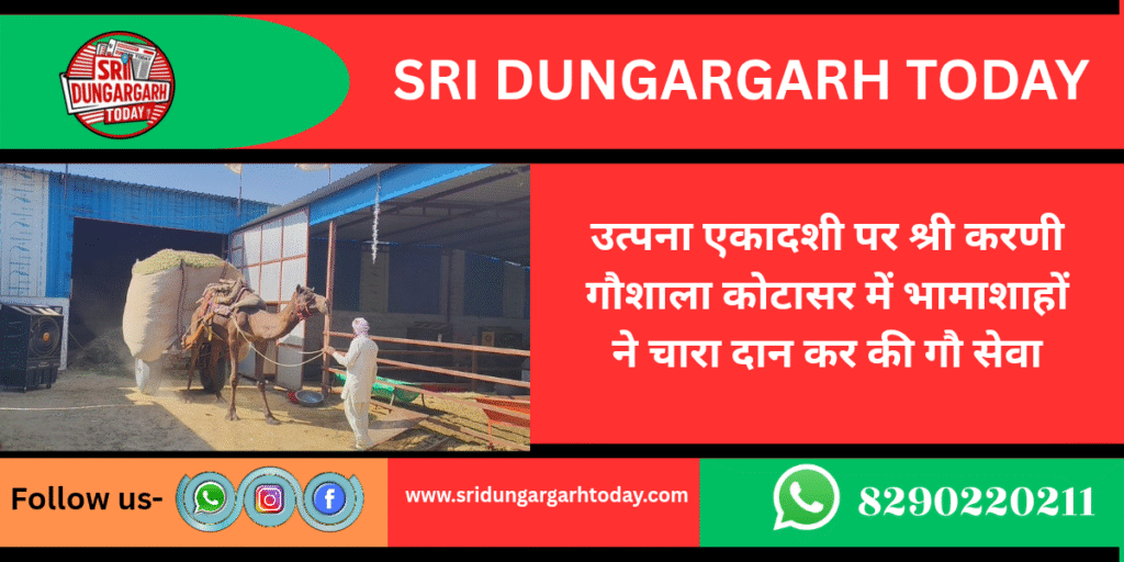 गांव कोटासर की श्री करणी गौशाला में आज उत्पना एकादशी पर भामाशाहों ने गौ सेवा हेतु मूंगफली का चारा समर्पित कर गौ सेवा का सौभाग्य प्राप्त किया भामाशाह ओंकारमल मूंधड़ा, पुरखचंद मूंधड़ा, दुलचासर ठेकेदार गणेशमल नागल सुथार दुलचासर हाल मुंबई,रामरतन धारणिया सावंतसर, लखनलाल धारणिया सांवतसर, ईमी चंद खीचड़ सांवतसर सहित दानदाताओं ने एक-एक झाल मूंगफली चारा दान कर गौ सेवा का सौभाग्य प्राप्त किया। वहीं बड़ोदरा प्रवासी सत्येंद्र प्रसाद गुप्ता बरेली, किशन लाल धारणिया सांवतसर ने एक एक पेटी गुड़ का लगाया गोवंश को भोग। गौशाला समिति ने सभी दानदाताओं को धन्यवाद देते हुए आभार जताया।